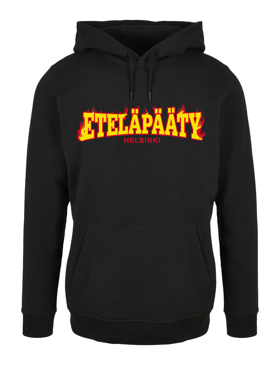 Laadukas ja eettisesti valmistettu musta huppari, edessä ”Flames Logo” -painatus.