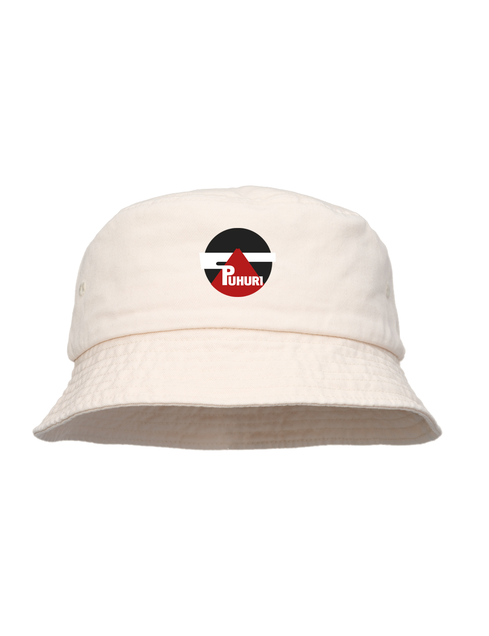 High-quality adult Ivory Bucket Hat with "Puhuri Crest" print on the front.