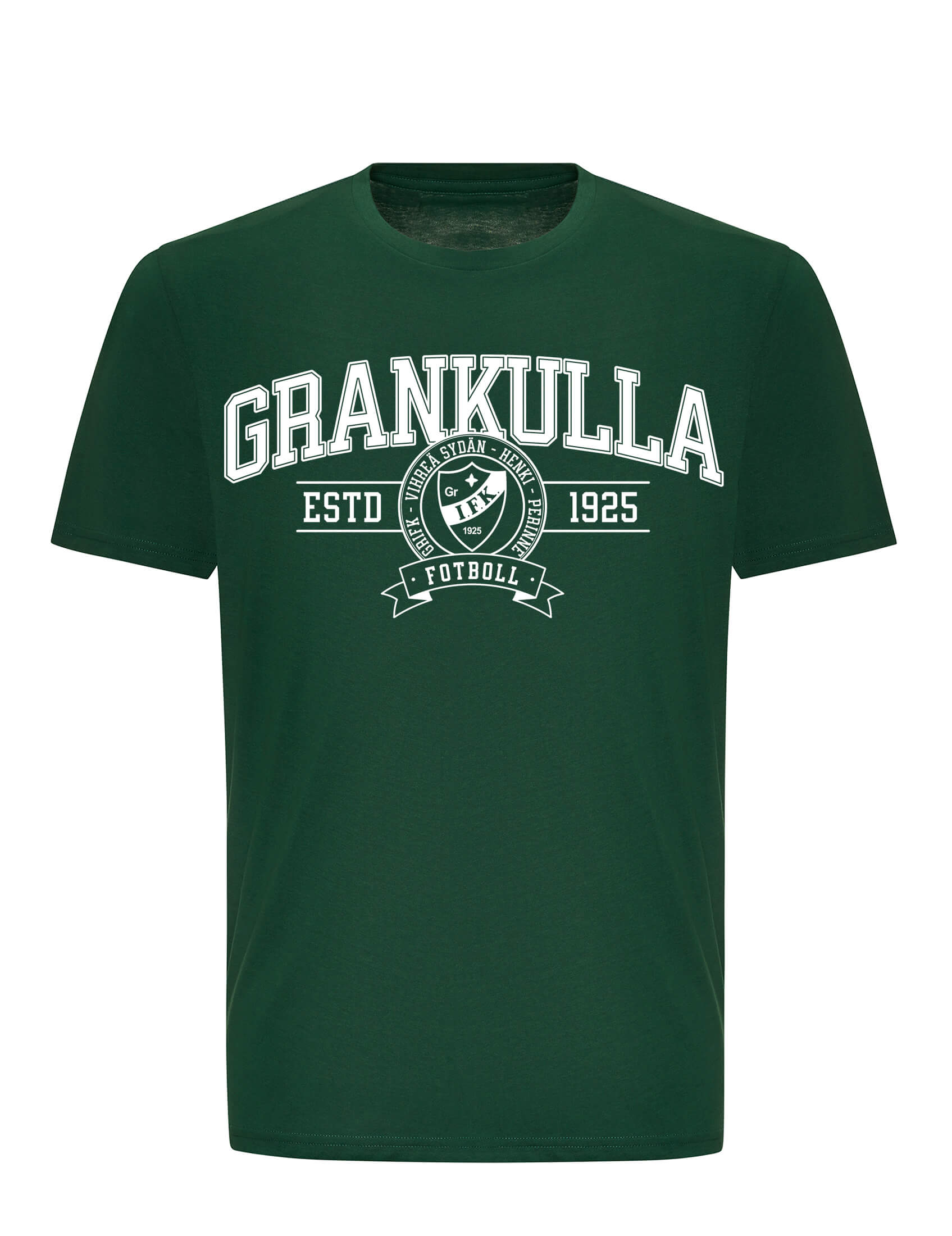 Laadukas ja eettisesti valmistettu tummanvihreä t-paita, edessä ”Grankulla Heritage Emblem” -painatus.