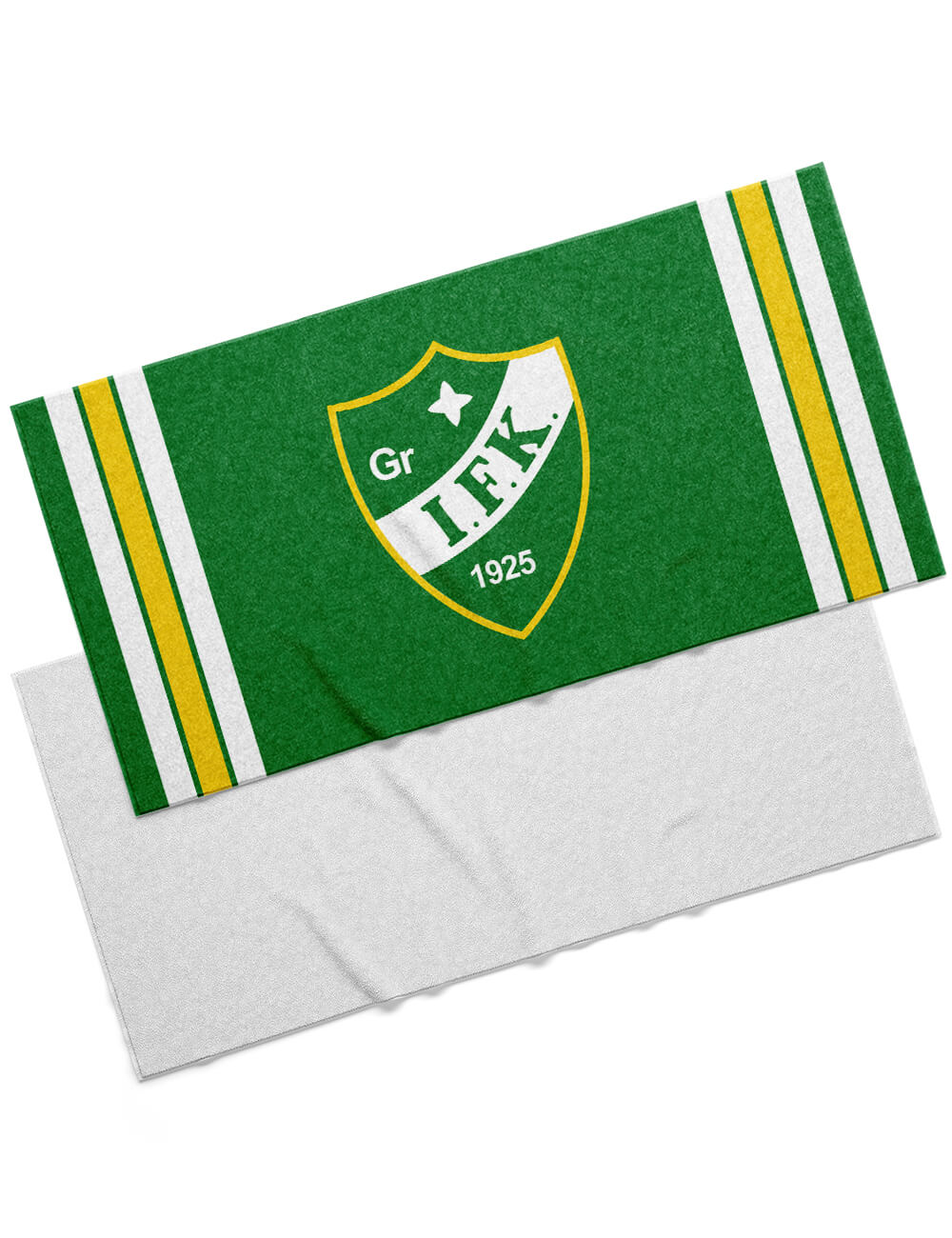 GrIFK-kylpypyyhe, edessä hieno joukkueteemainen painatus ja pyyhkeen toinen puoli valkoinen. Koko: 140cm X 70cm.