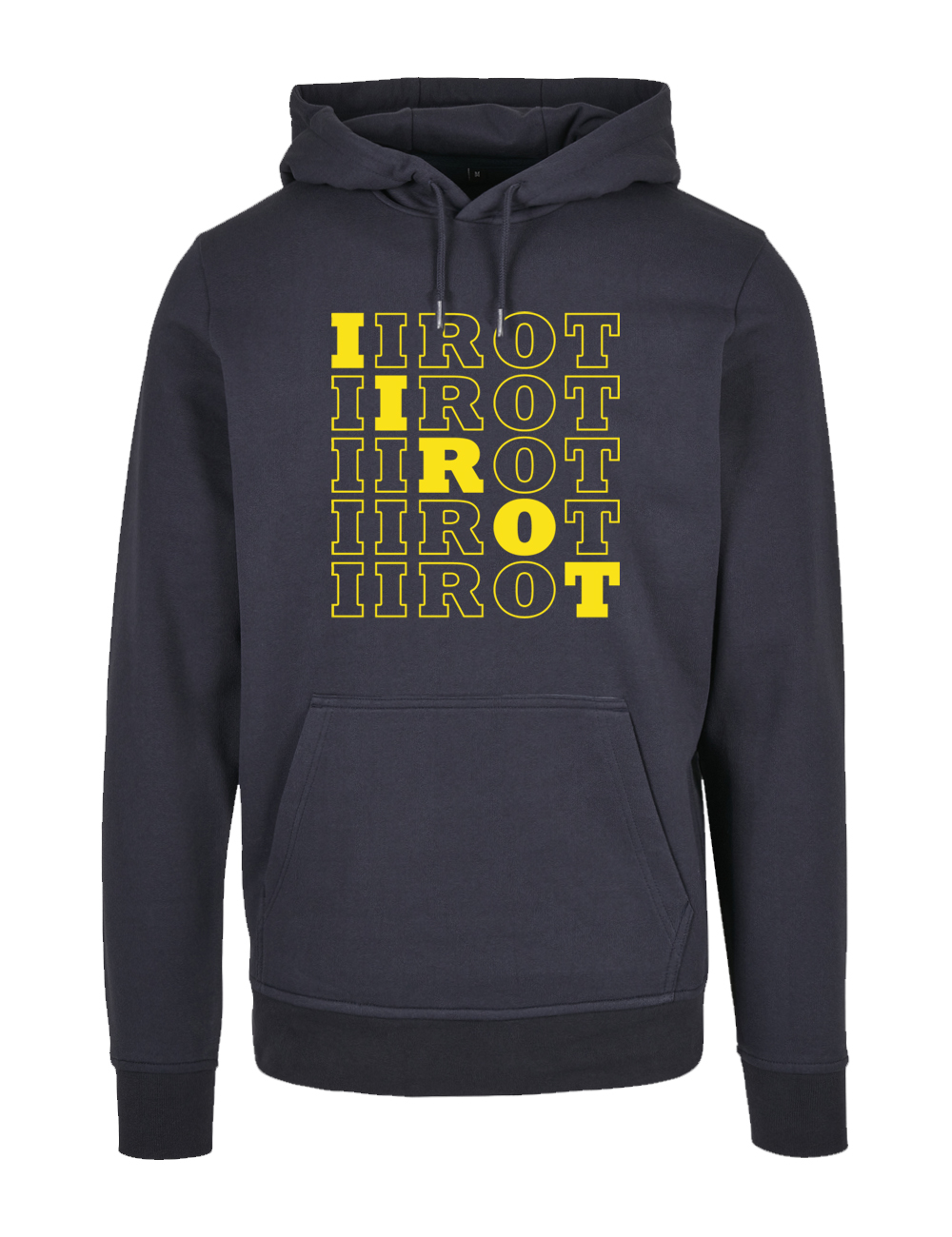 Laadukas vastuullisesti valmistettu aikuisten tummansininen huppari, jossa edessä ”Iirot” -painatus.
