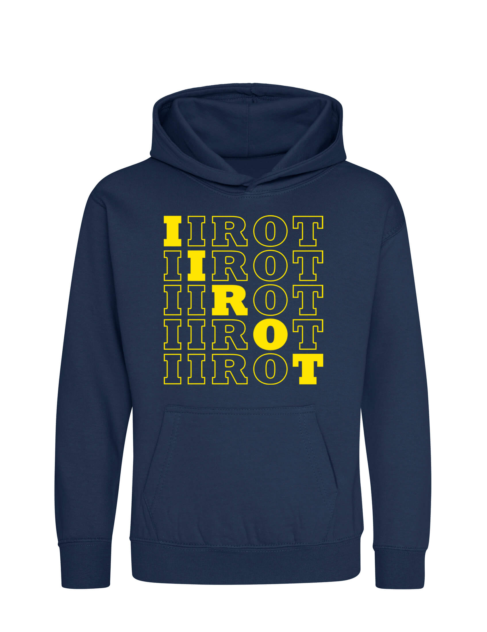 Laadukas vastuullisesti valmistettu lasten tummansininen huppari, jossa edessä “Iirot” -painatus.