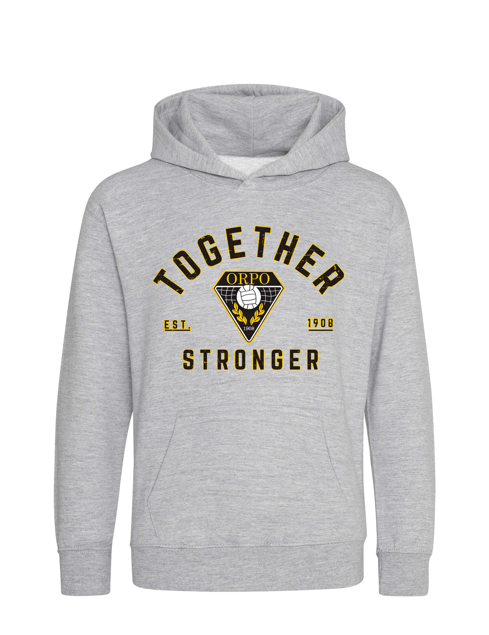Laadukas vastuullisesti valmistettu lasten vaaleanharmaa huppari, jossa edessä ”Together, Stronger Distressed” -painatus.