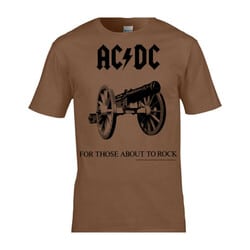Virallinen AC/DC -fanituote. Ruskea aikuisten t-paita, jossa edessä ”For Those About To Rock” -painatus.