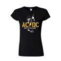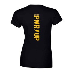 Virallinen AC/DC -fanituote. Musta naisten t-paita, jossa edessä ja takana ”PWR Up Shot In The Dark” -painatus.