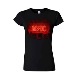 Virallinen AC/DC -fanituote. Musta naisten t-paita, jossa edessä ”PWR Up Stage” -painatus.