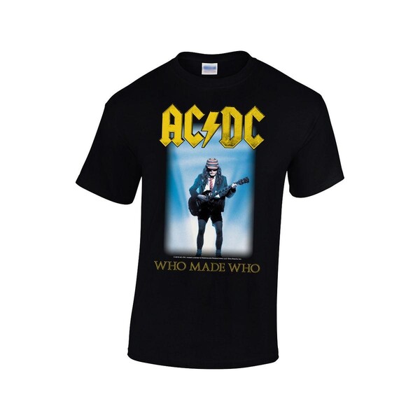 Virallinen AC/DC -fanituote. Musta aikuisten t-paita, jossa edessä ”Who Made Who” -painatus.