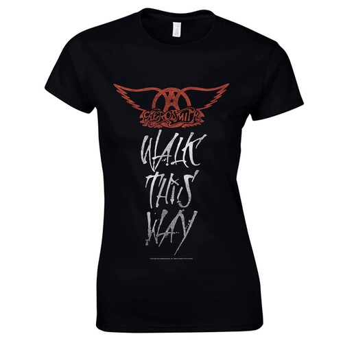 Virallinen Aerosmith -fanituote. Musta naisten t-paita, jossa edessä ”Walk This Way” -painatus.