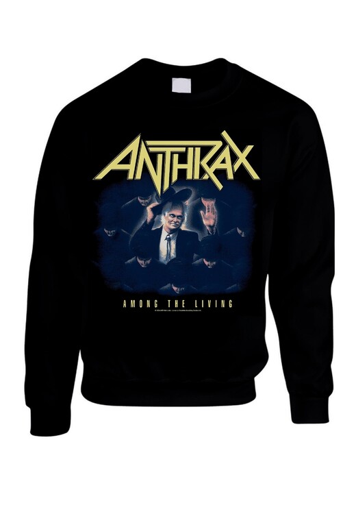 Virallinen Anthrax -fanituote. Musta aikuisten collegepaita, jossa edessä ”Among the Living” -painatus.