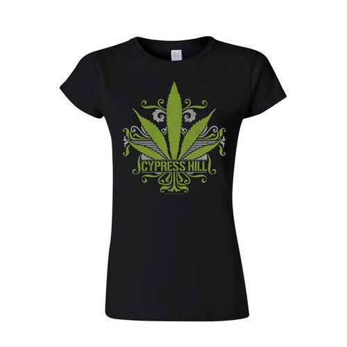 Virallinen Cypress Hill -fanituote. Musta naisten t-paita, jossa edessä ”California Sweet Leaf” -painatus.