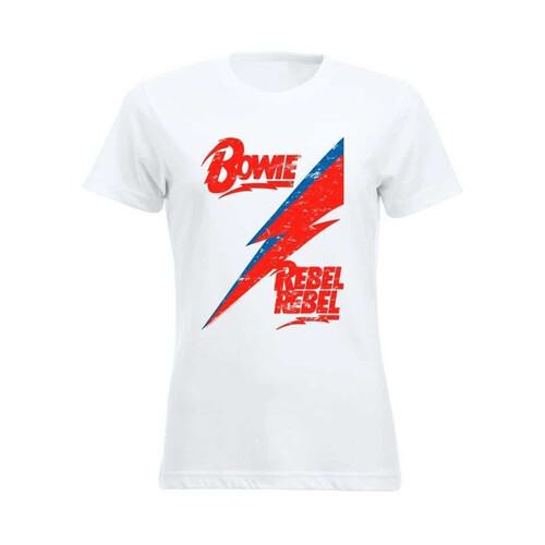 Virallinen David Bowie -fanituote. Valkoinen naisten t-paita, jossa edessä ”Rebel, Rebel” -painatus.