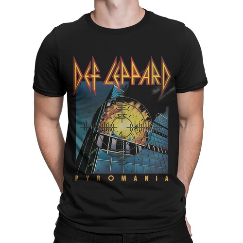 Virallinen Def Leppard -fanituote. Musta aikuisten t-paita, jossa edessä ”Pyromania” -painatus.