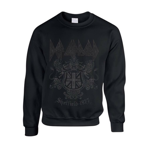 Virallinen Def Leppard -fanituote. Musta aikuisten collegepaita, jossa edessä ”Sheffield 1977” -painatus.