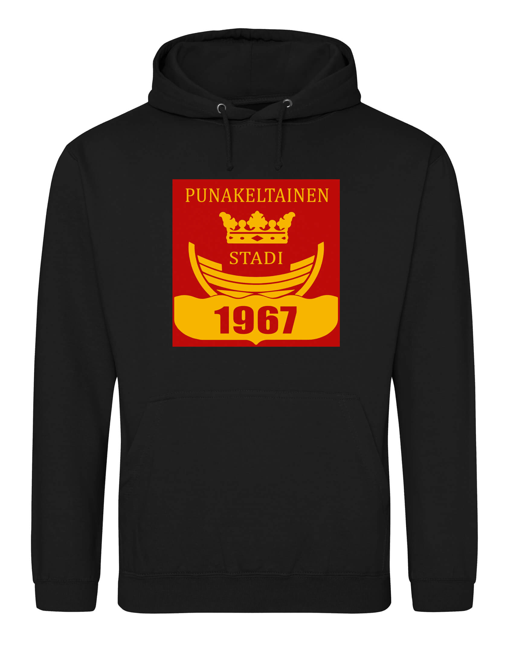 Laadukas ja eettisesti valmistettu musta huppari, edessä ”Punakeltainen Stadi” -painatus.