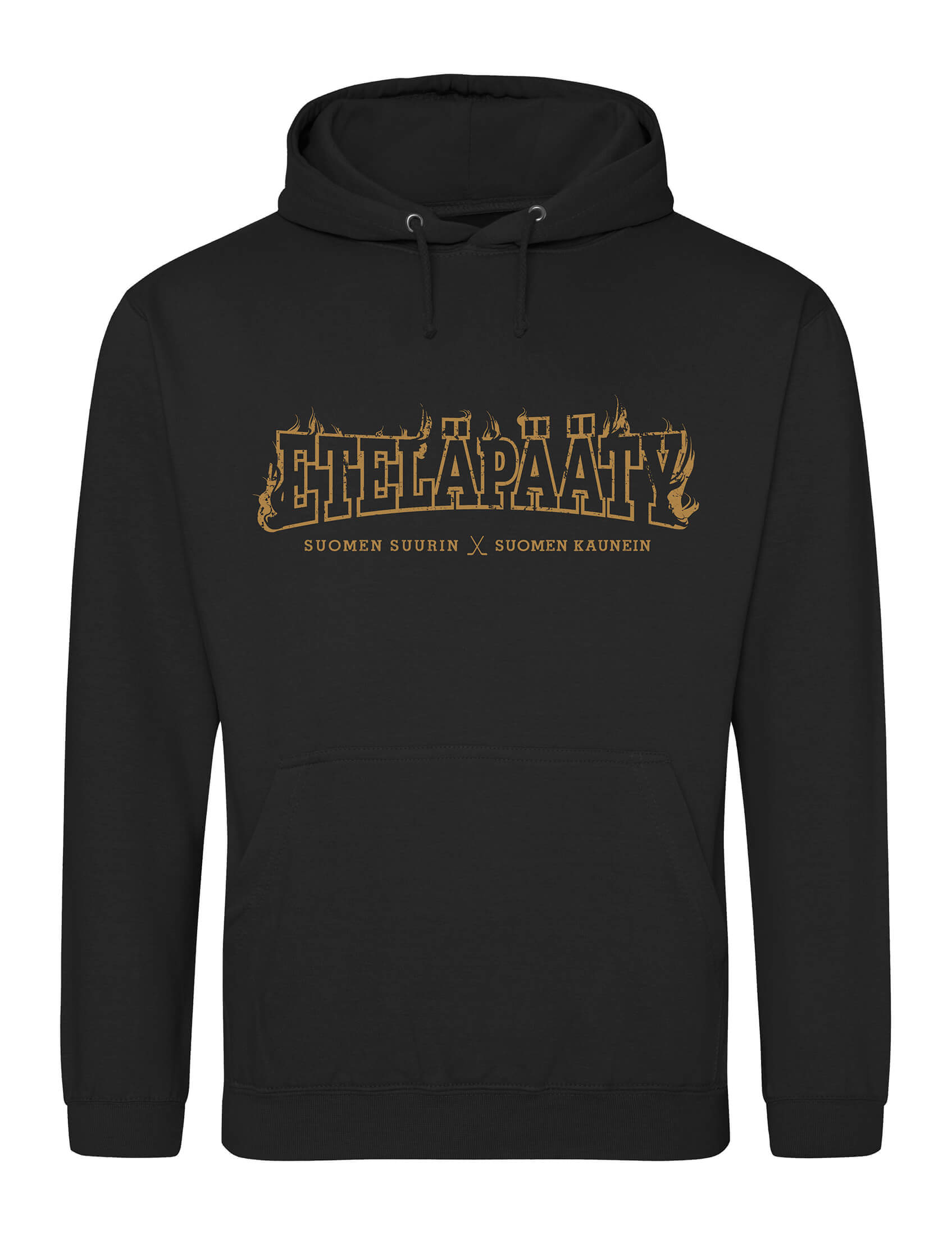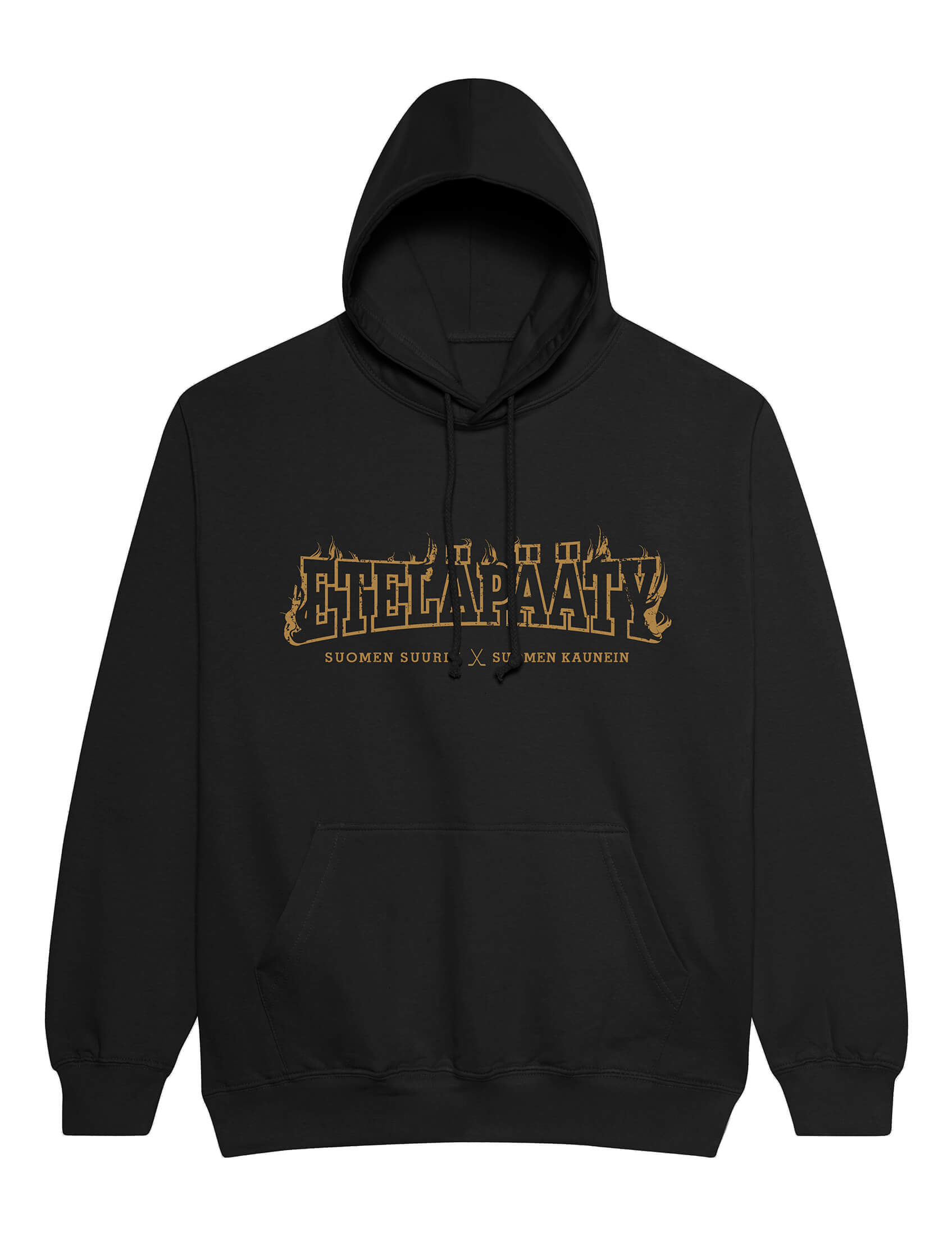 Laadukas ja eettisesti valmistettu musta huppari, edessä kultainen ”Suomen Suurin, Suomen Kaunein” -painatus.