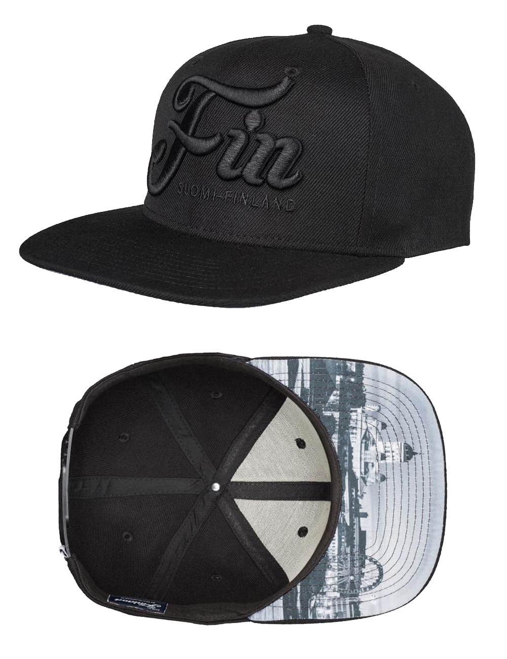 Fin suoralippainen lippalakki. Edessä iso 3D brodeeraus, takana Suomen lippu saumamerkki sekä 2D EST. 1917 brodeeraus. Lipan alla valokuva.