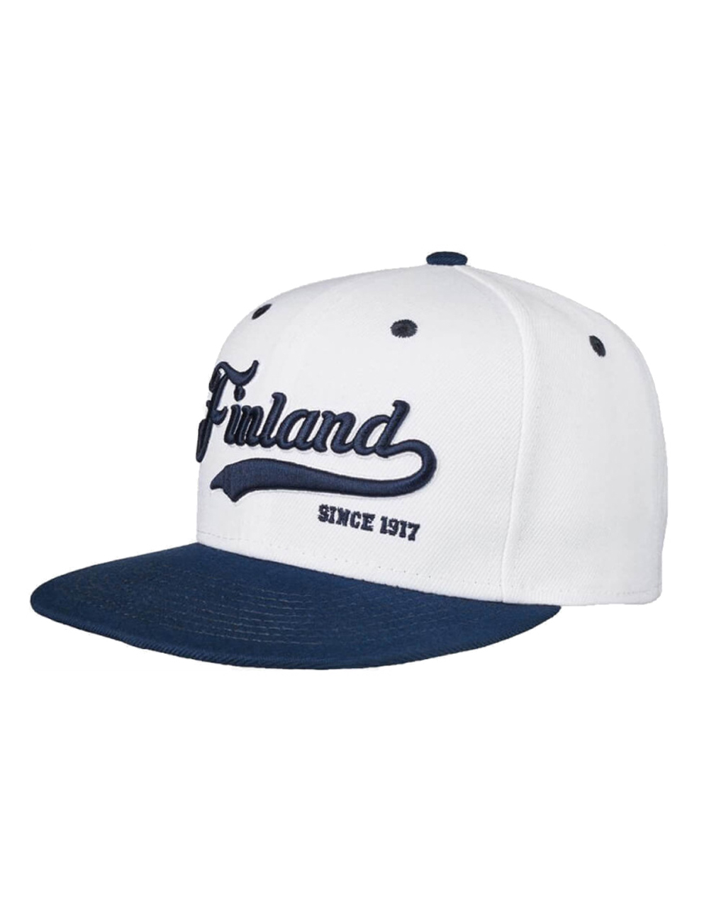 Finland suoralippainen lippalakki. Edessä iso 3D -brodeeraus, takana Suomenlippu -saumamerkki sekä 2D EST. 1917 -brodeeraus.