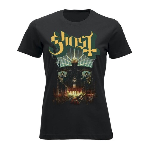 Virallinen Ghost -fanituote. Musta naisten t-paita, jossa edessä ”Meliora” -painatus.