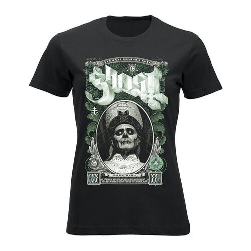 Virallinen Ghost -fanituote. Musta naisten t-paita, jossa edessä ”Papa Nihil” -painatus.