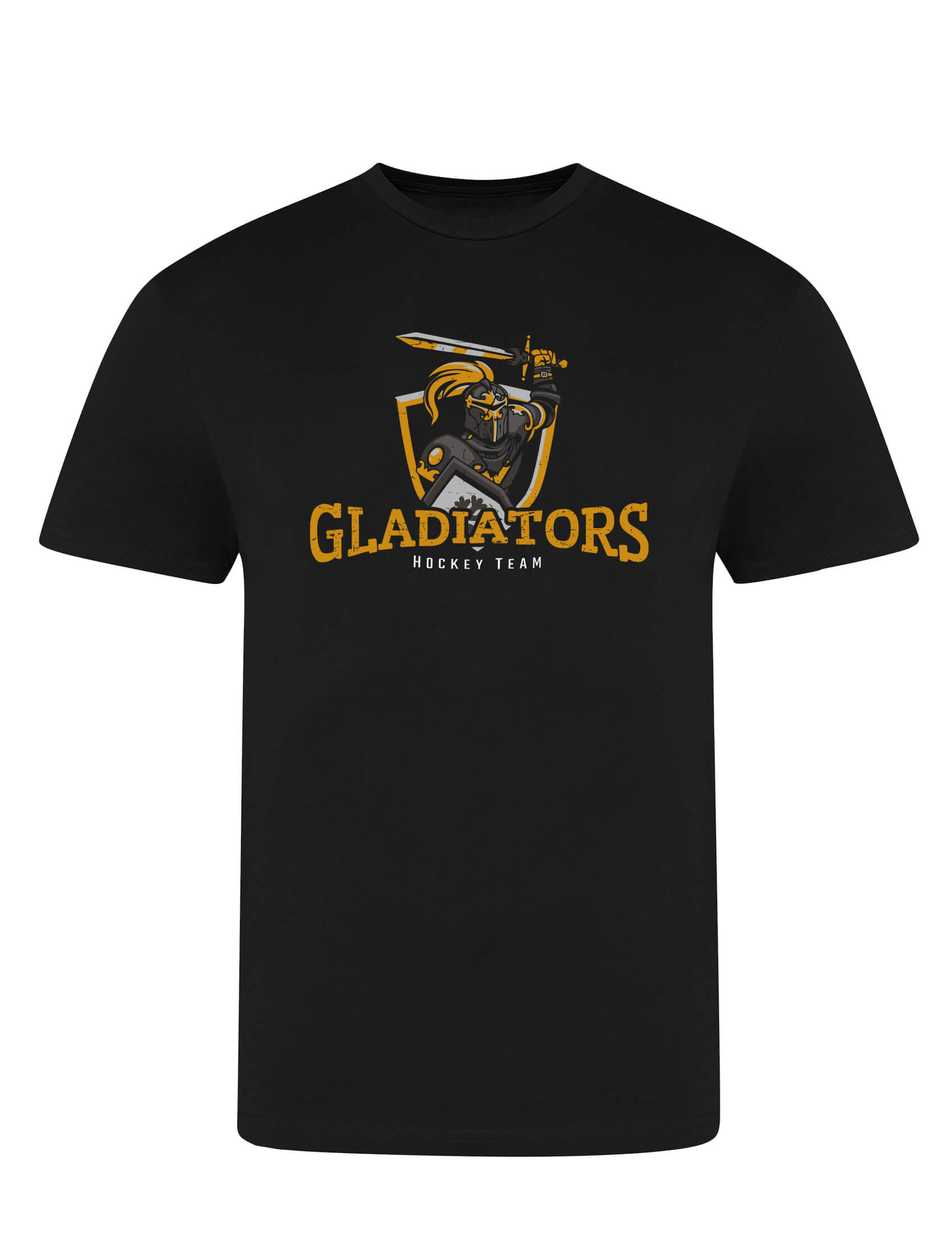 Laadukas vastuullisesti valmistettu aikuisten musta t-paita, jossa edessä ”Gladiator Shield Distressed” -painatus.