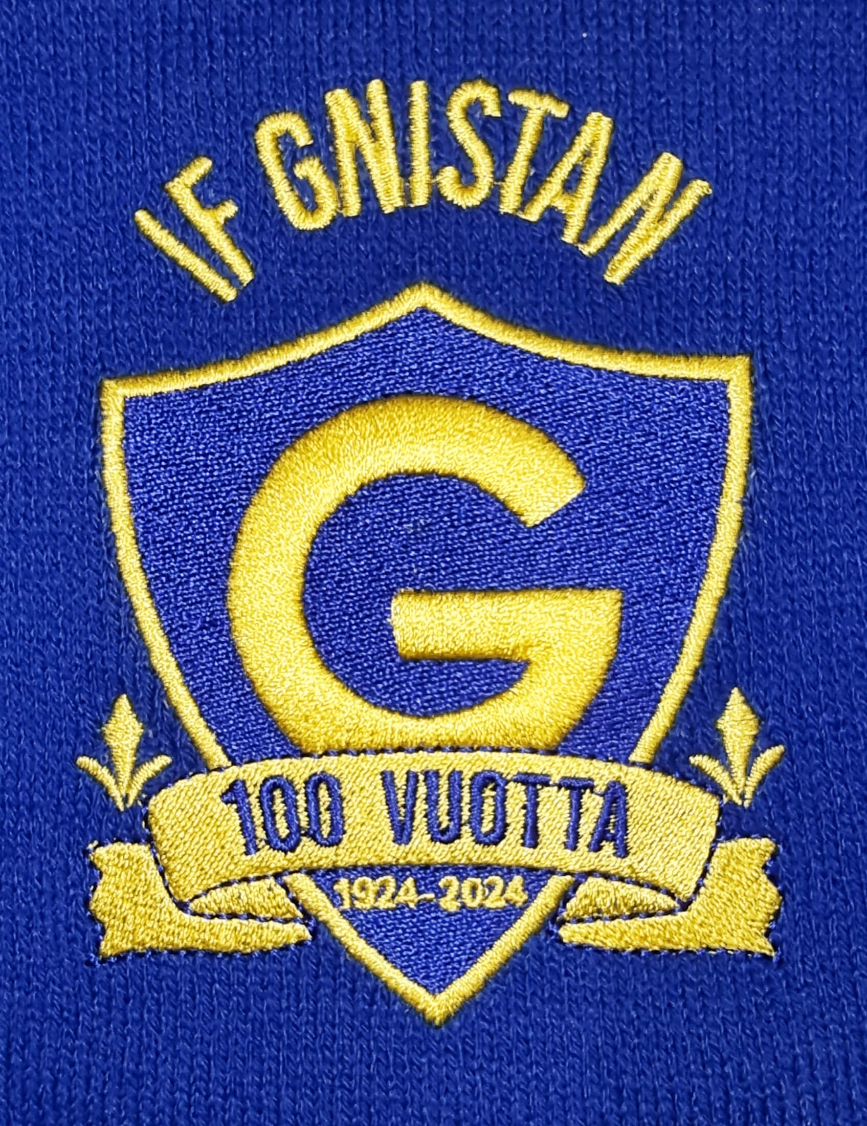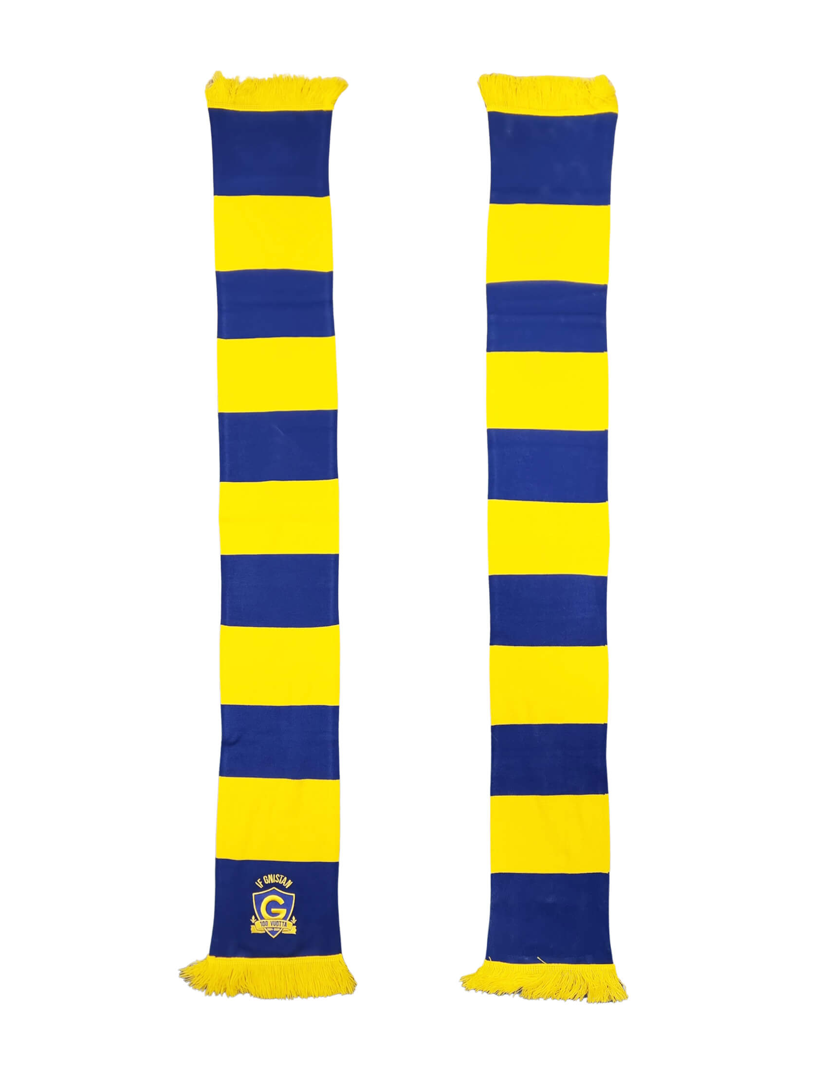 Supersuosittu raidallinen 100-vuotis juhlahuivi tekee paluun! Lämpimästä materiaalista valmistettu 130cm X 19cm IF Gnistan kaulahuivi, jossa päädyssä brodeerattu 100-vuotis logo.