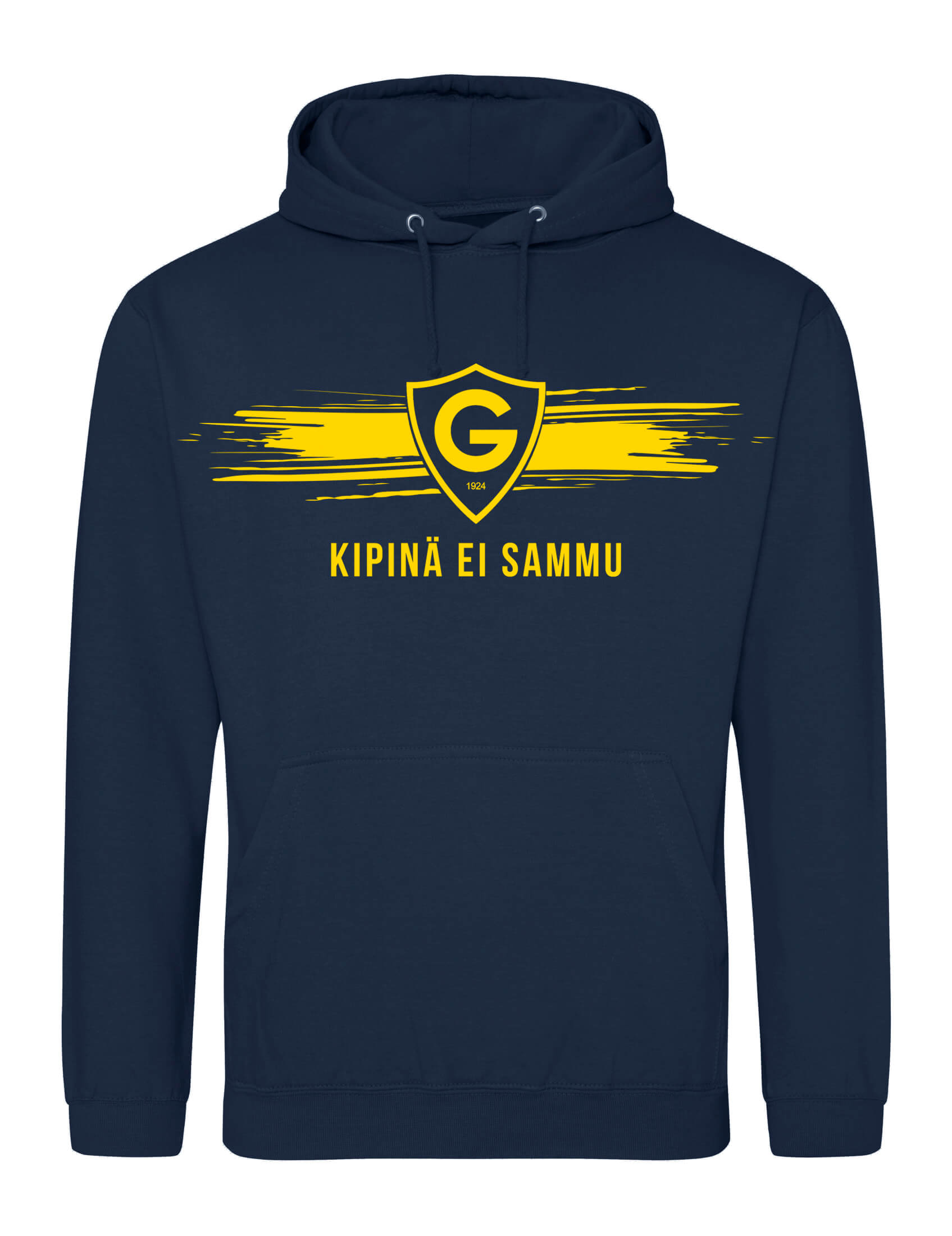 Laadukas vastuullisesti valmistettu aikuisten tummansininen huppari, jossa edessä ”Kipinä Ei Sammu” -painatus.