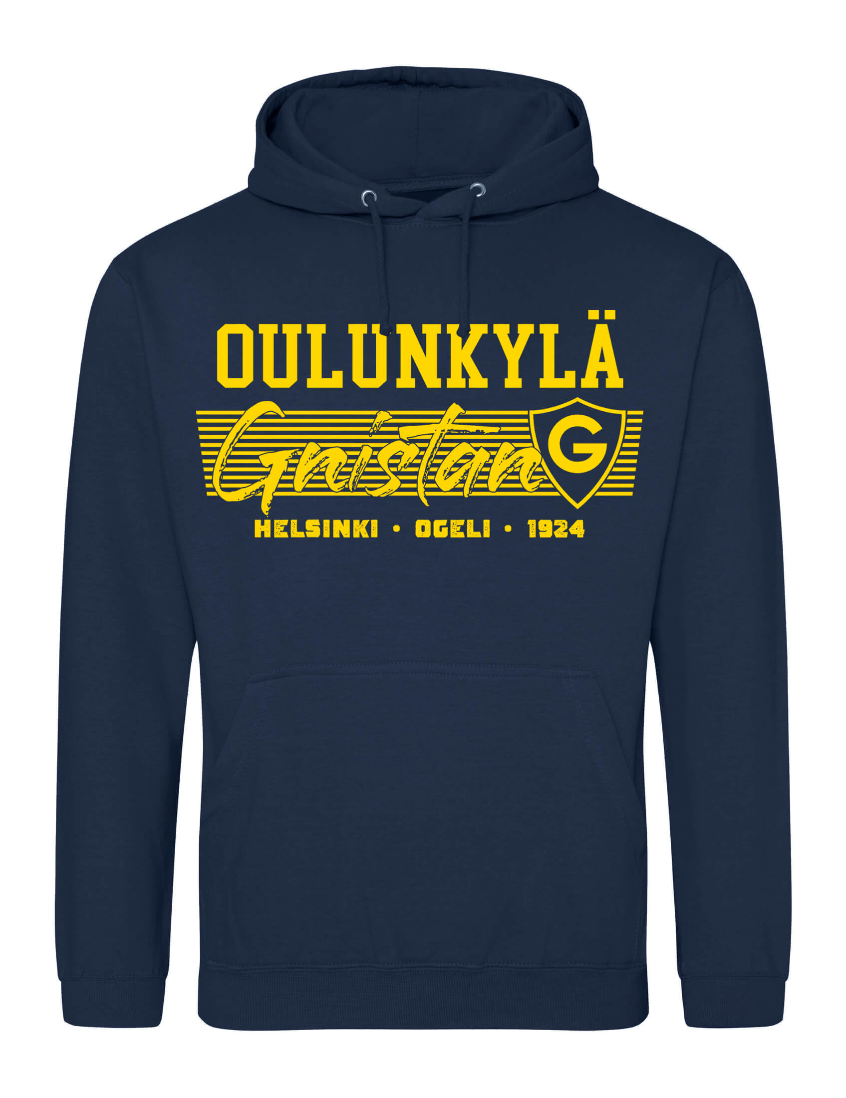 Laadukas vastuullisesti valmistettu aikuisten tummansininen huppari, jossa edessä ”Lineae Oulunkylä” -painatus.