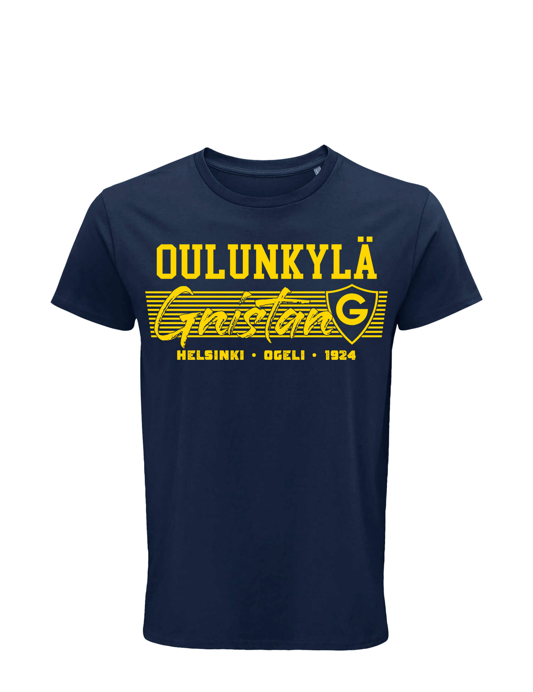 Laadukas vastuullisesti valmistettu lasten tummansininen t-paita, jossa edessä ”Lineae Oulunkylä” -painatus.
