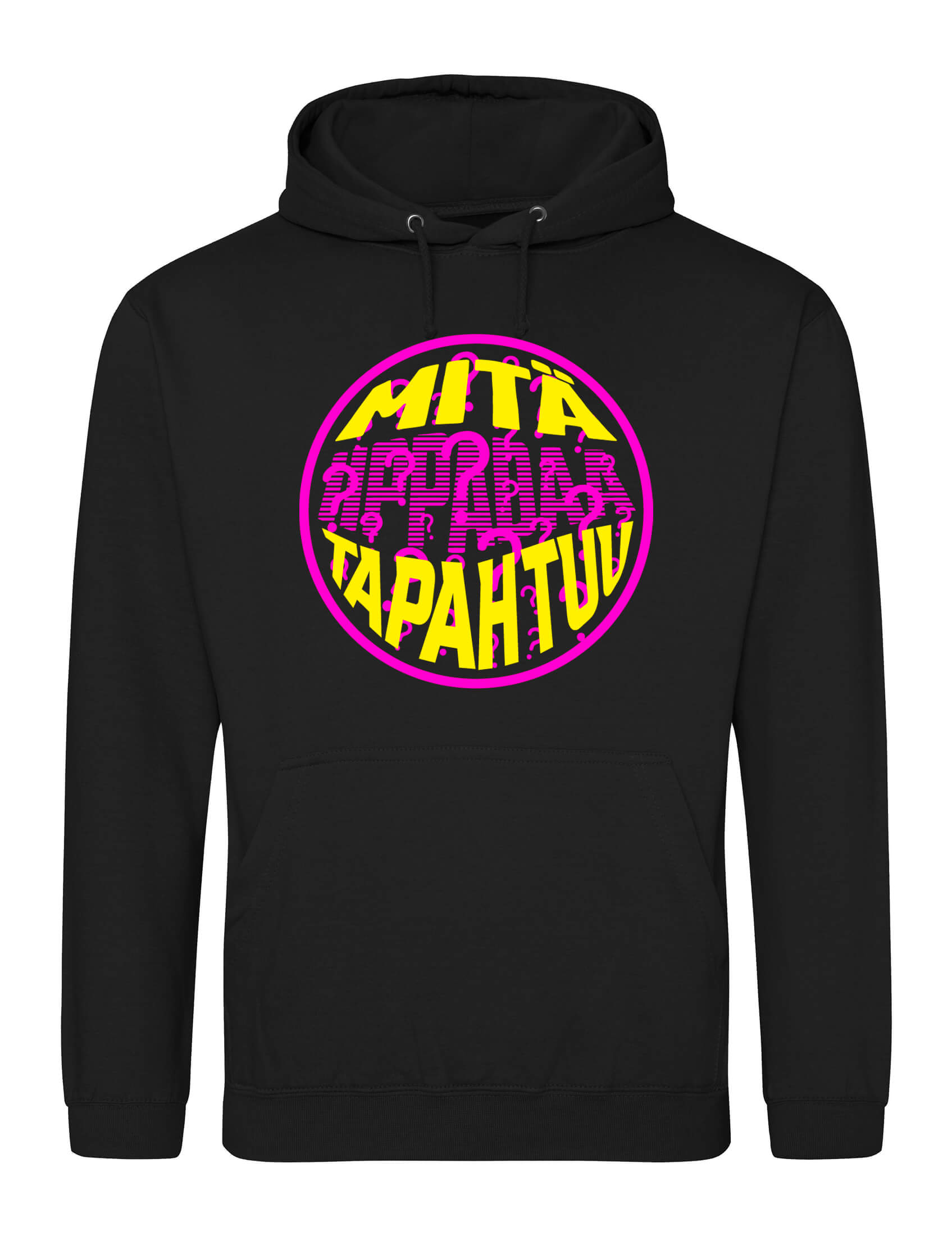 Laadukas ja vastuullisesti valmistettu musta aikuisten huppari. Miellyttävä ja kestävä kangas tekee hupparista mukavan jokapäiväiseen käyttöön. Edessä ”Mitä Tapahtuu?” -painatus.