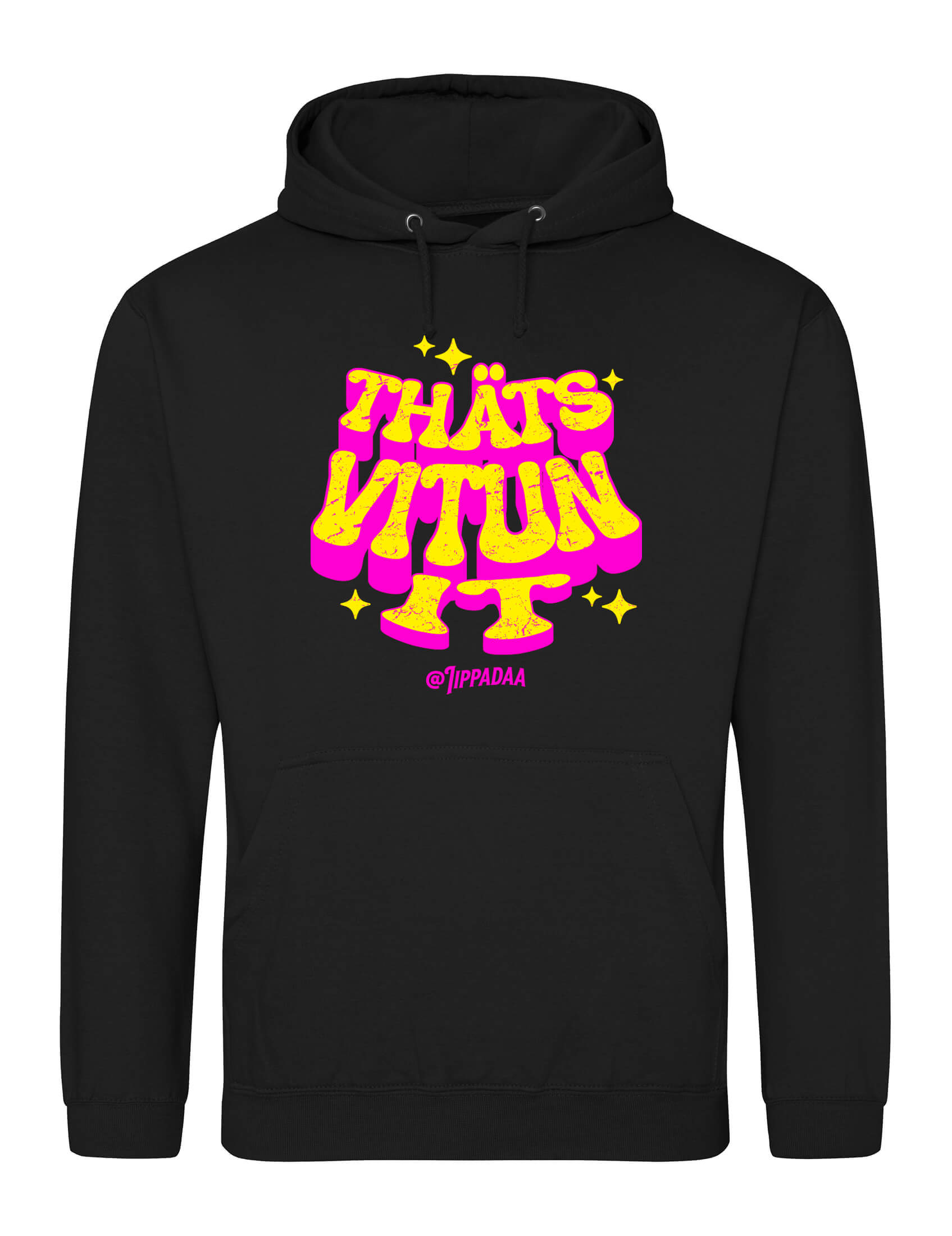 Laadukas ja vastuullisesti valmistettu musta aikuisten huppari. Miellyttävä ja kestävä kangas tekee hupparista mukavan jokapäiväiseen käyttöön. Edessä ”Thäts Vitun It” -painatus.