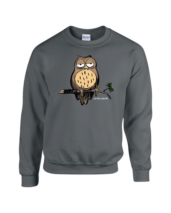 Virallinen Kamala Luonto -fanituote. Tummanharmaa aikuisten collegepaita, jossa edessä ”Pöllö” -painatus.