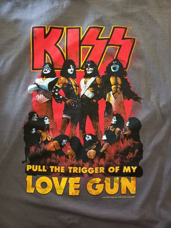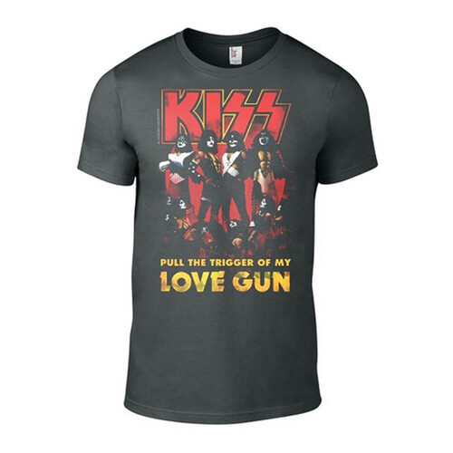 Virallinen KISS -fanituote. Tummanharmaa aikuisten t-paita, jossa edessä ”Love Gun” -painatus.