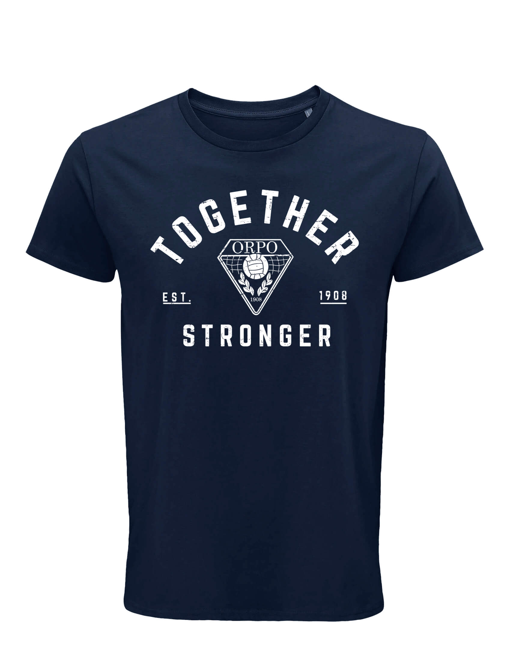 Laadukas vastuullisesti valmistettu aikuisten tummansininen t-paita, jossa edessä ”Together, Stronger Distressed” -painatus.