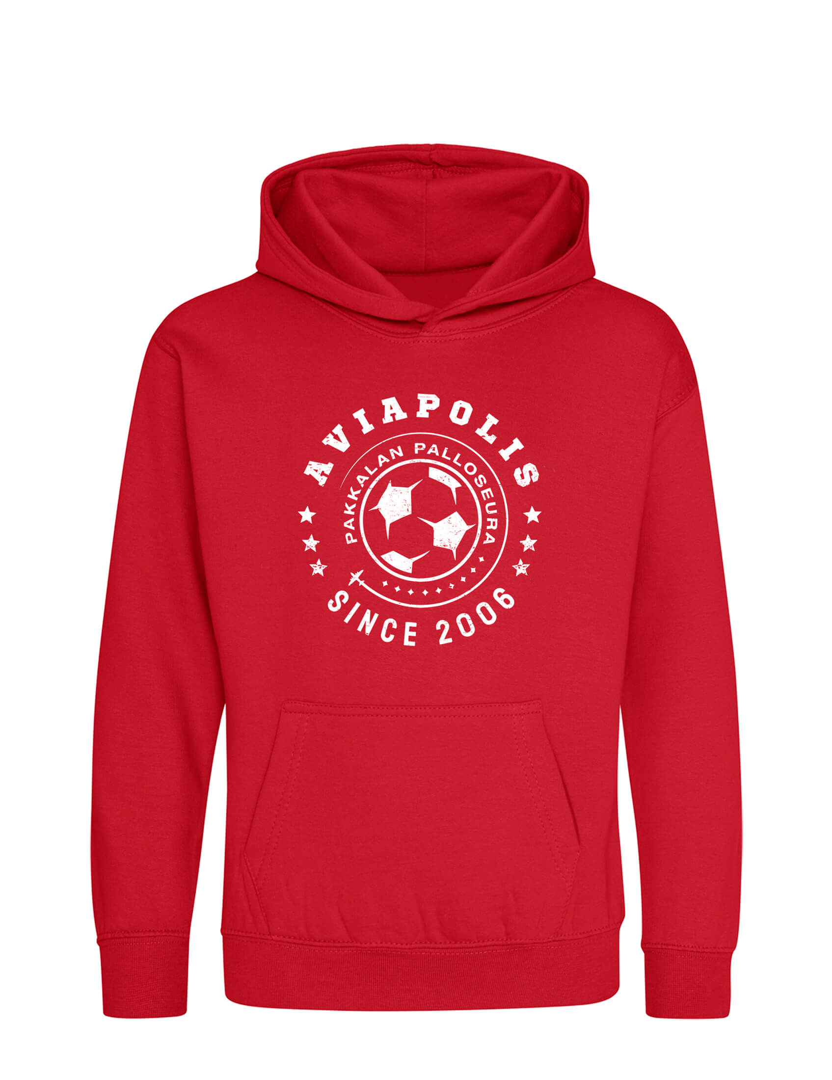 Sporttinen ja trendikäs punainen lasten huppari. Laadukas huppari on valmistettu korkeatasoisista materiaaleista. Edessä ”Aviapolis” -painatus.