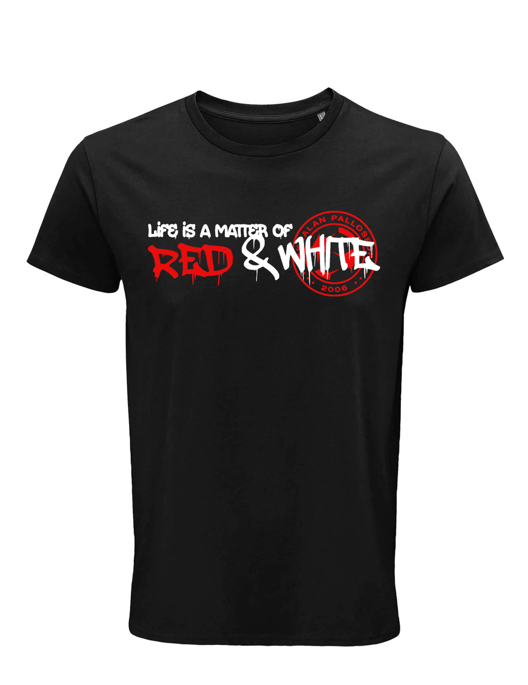 Laadukas ja vastuullisesti valmistettu musta aikuisten t-paita. Paita on valmistettu 100 % puolikammatusta, rengaskehrätystä puuvillasta — pehmeästä ja kestävästä materiaalista, joka tuntuu miellyttävältä päällä ja säilyttää muotonsa pesunkin jälkeen. Edessä ”Red & White Crew” -painatus.