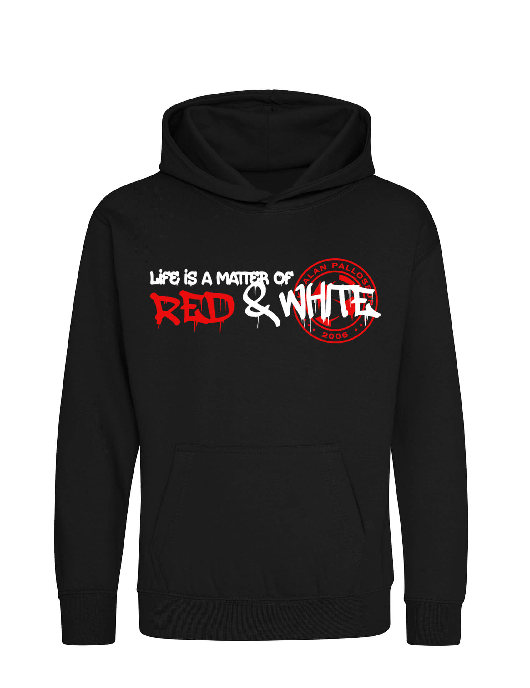 Laadukas ja vastuullisesti valmistettu musta lasten huppari. Miellyttävä ja kestävä kangas tekee hupparista mukavan jokapäiväiseen käyttöön. Edessä ”Red & White Crew” -painatus.