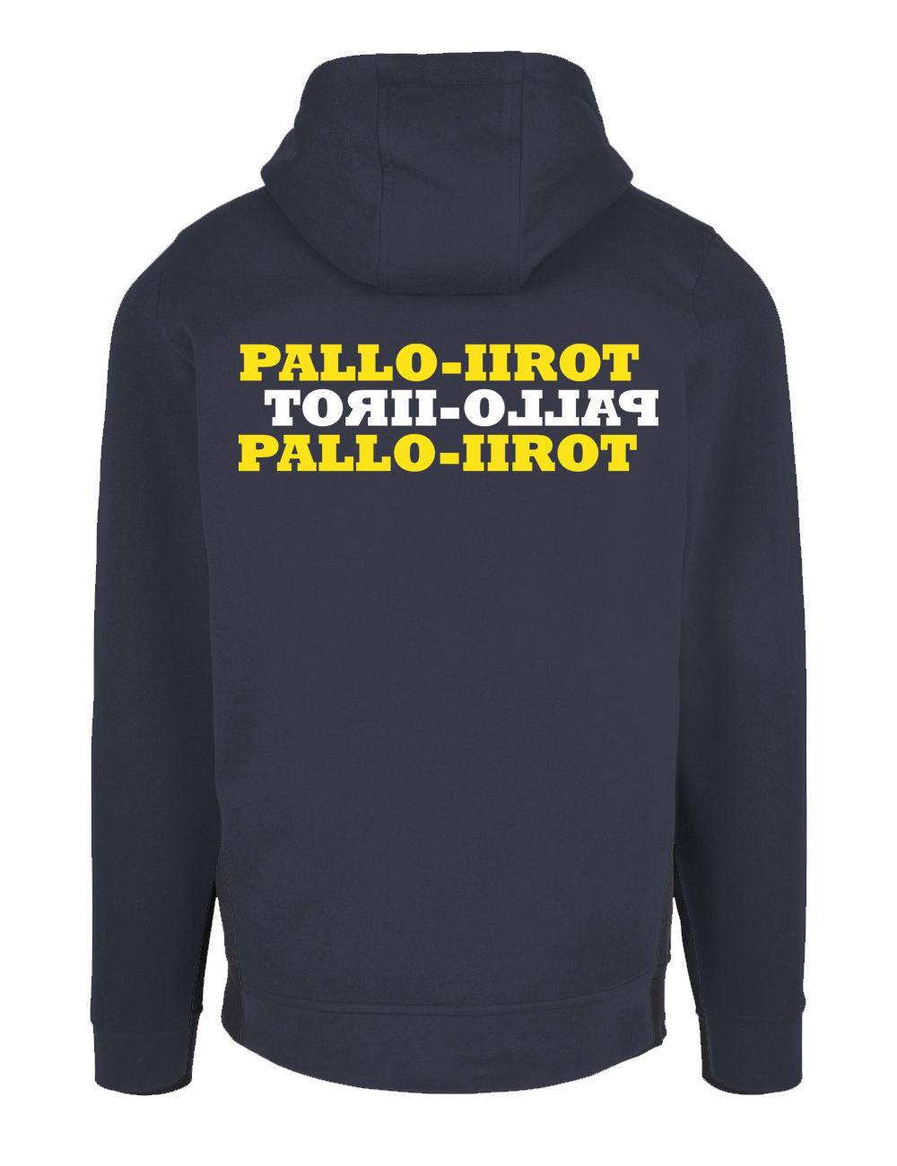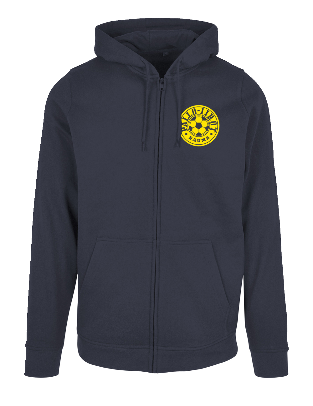 Laadukas vastuullisesti valmistettu aikuisten tummansininen vetoketjuhuppari, jossa edessä lofopainatus ja takana ”Text Print” -painatus.