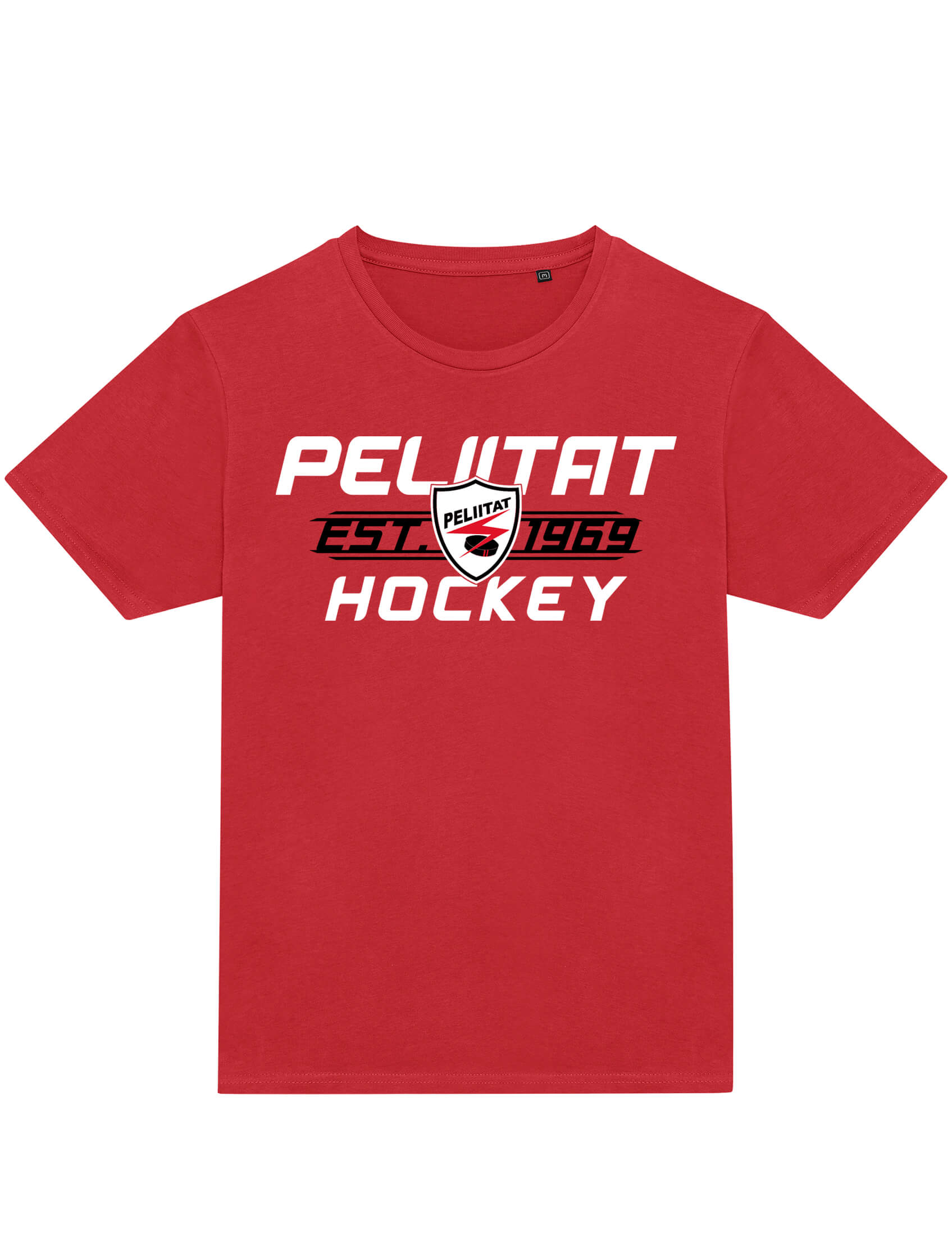 Laadukas ja eettisesti valmistettu punainen t-paita, edessä ”Hockey Red”  -painatus.