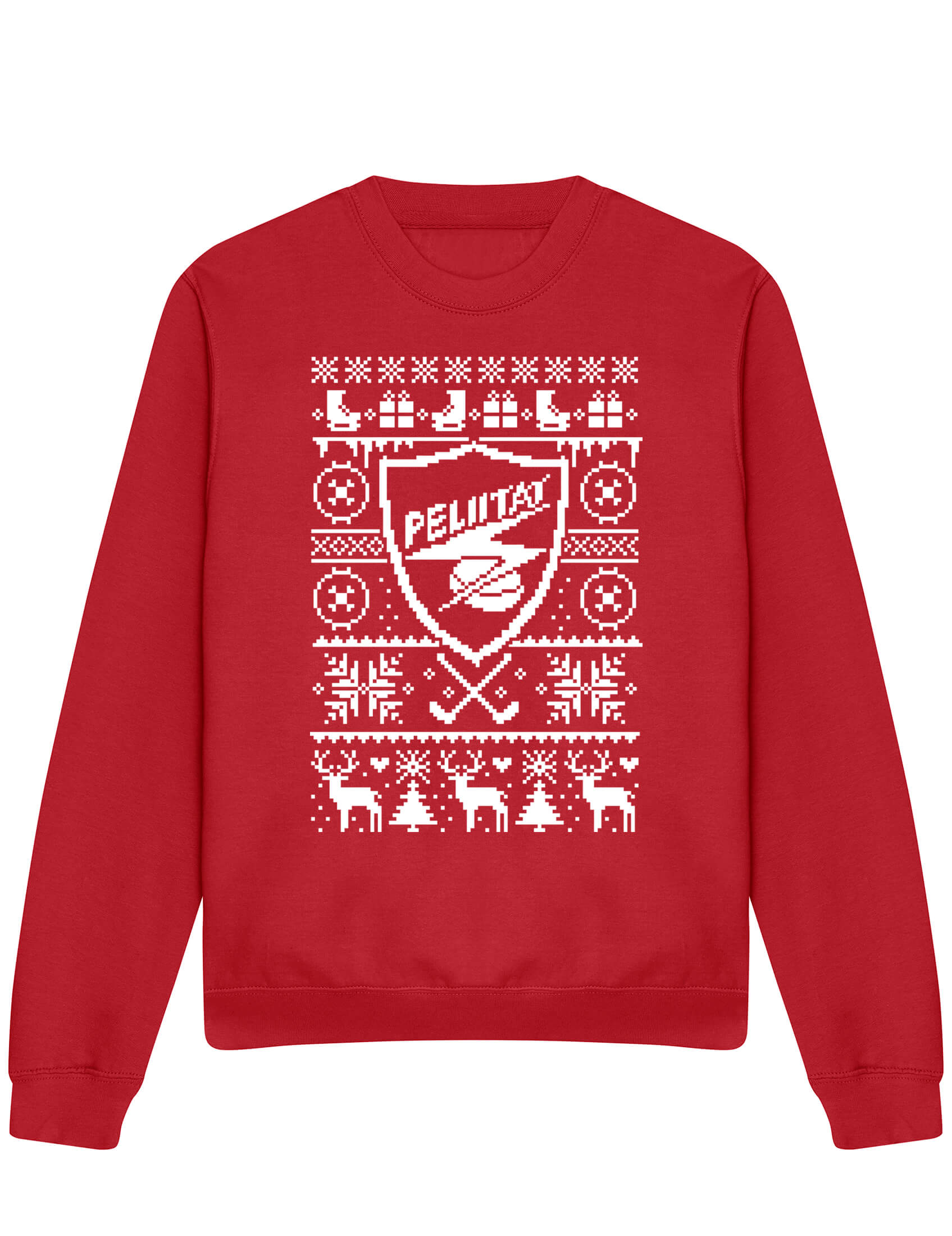 Laadukas ja eettisesti valmistettu punainen collegepaita, edessä jouluaiheinen ”Ugly Knit Print” -painatus.