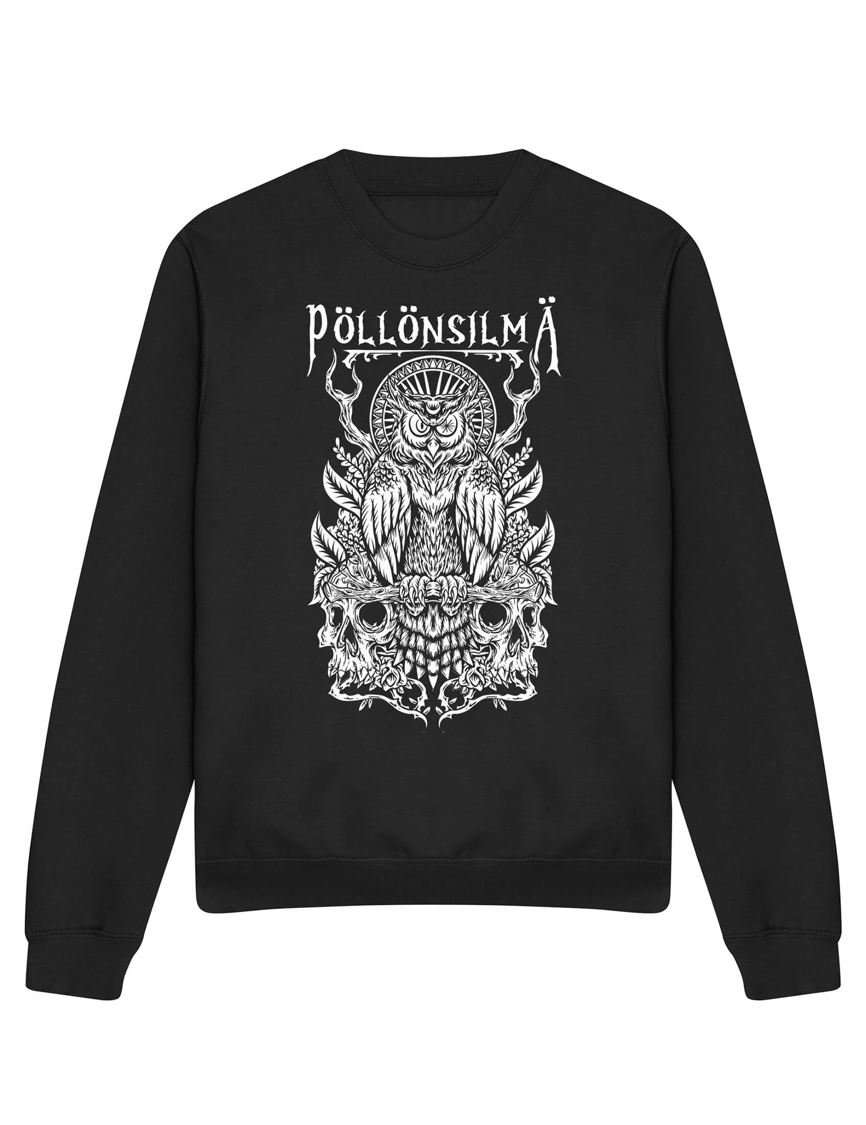 Laadukas vastuullisesti valmistettu aikuisten musta collegepaita, jossa edessä ”Pöllönsilmä Original” -painatus.