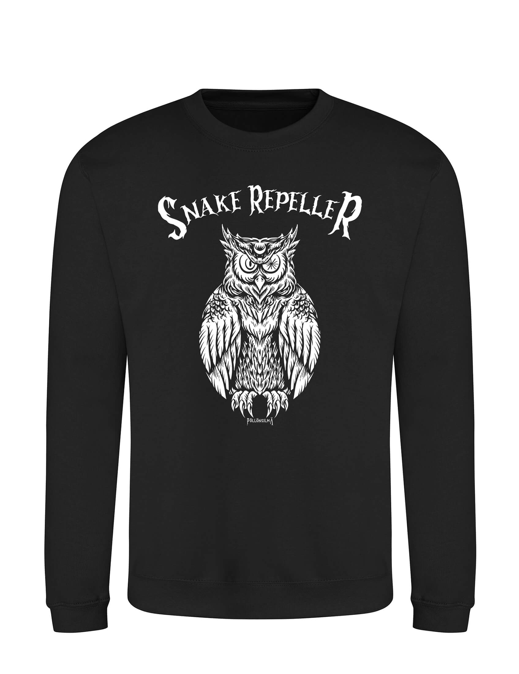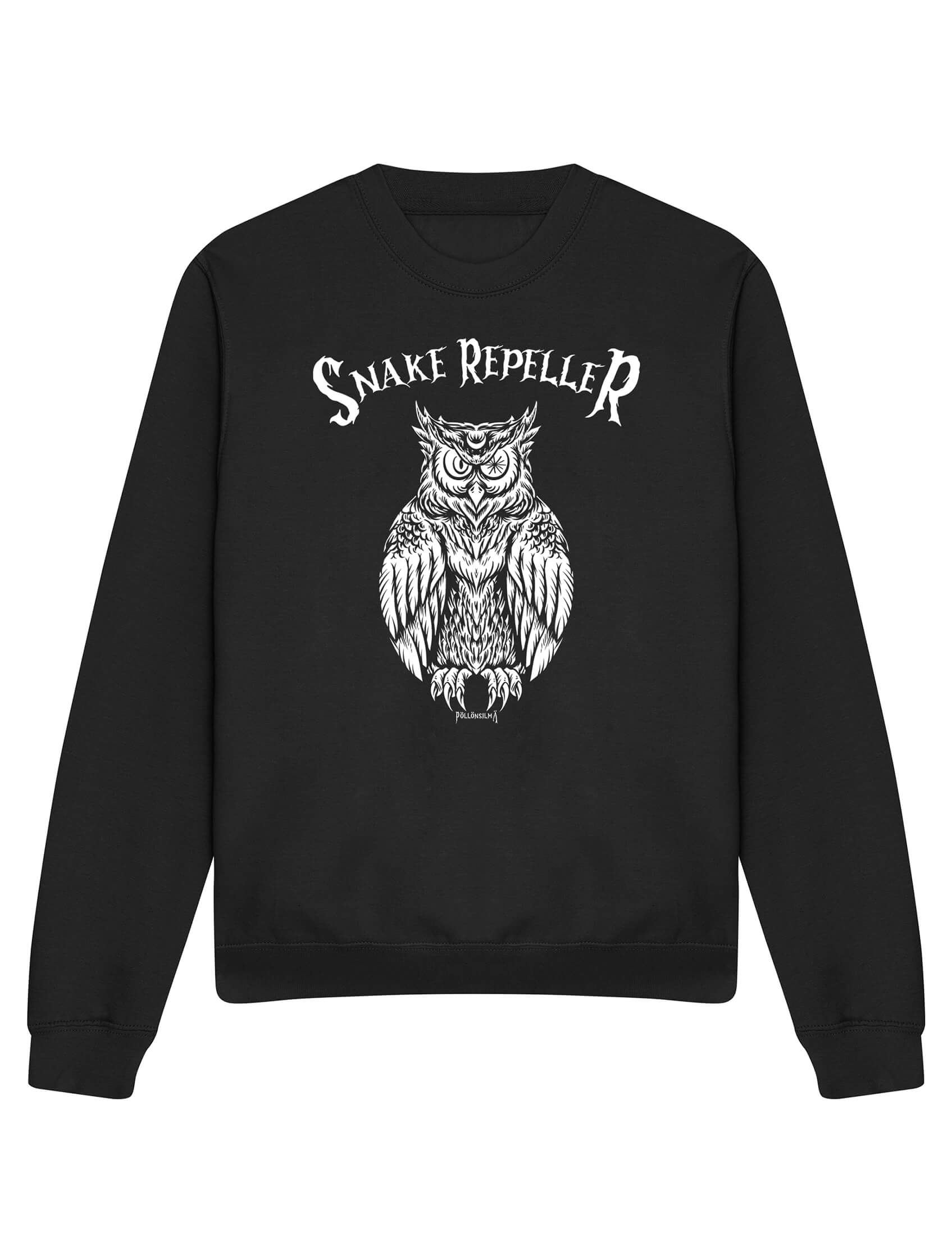Laadukas vastuullisesti valmistettu aikuisten musta collegepaita, jossa edessä Pöllönsilmä ”Snake Repeller” -painatus.