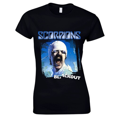 Virallinen Scorpions -fanituote. Musta naisten t-paita, jossa edessä ”Blackout” -painatus.