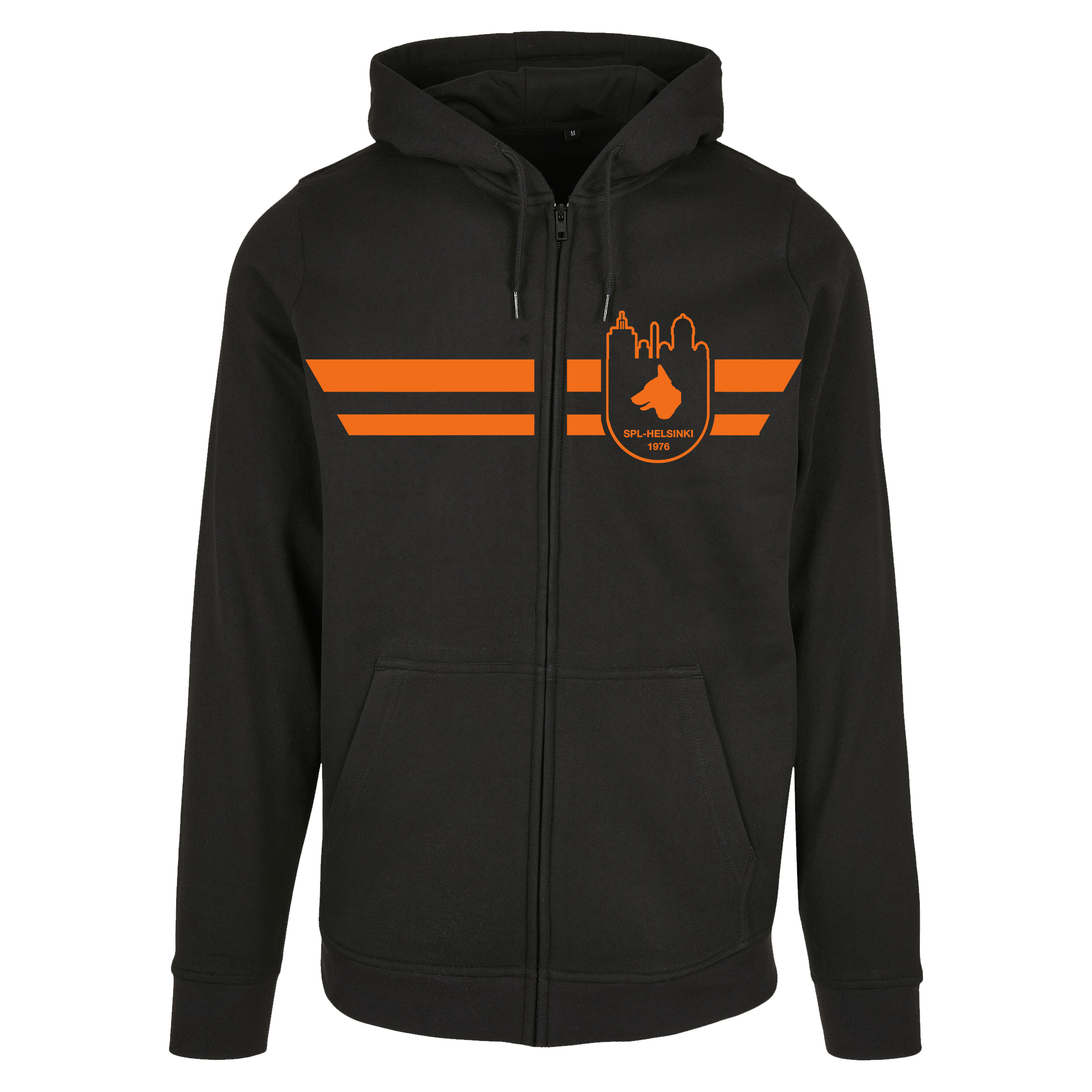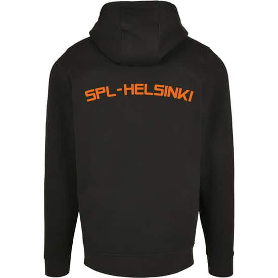 Laadukas aikuisten SPL-Helsinki vetoketjuhuppari, jossa edessä SPL-Helsinki logopainatus ja selässä tekstipainatus.