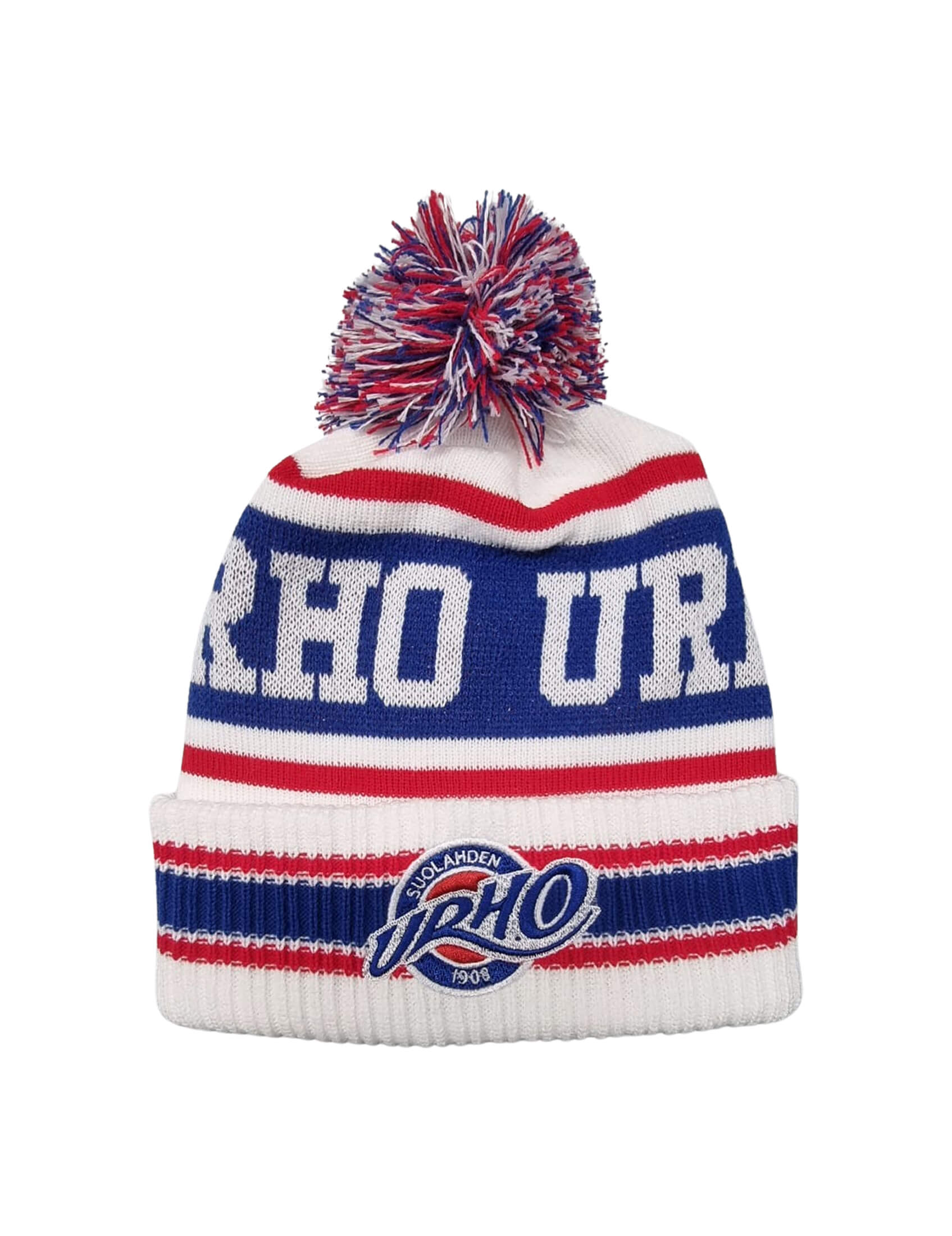 Tyylikäs kudottu Suolahden Urho tupsupipo. Edessä Urho -logobrodeeraus. Yksi koko, sopii useimmille.
