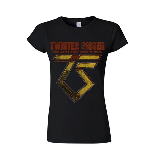 Virallinen Twisted Sister -fanituote. Musta naisten t-paita, jossa edessä ”You Can’t Stop Rock ´n´ Roll” -painatus.