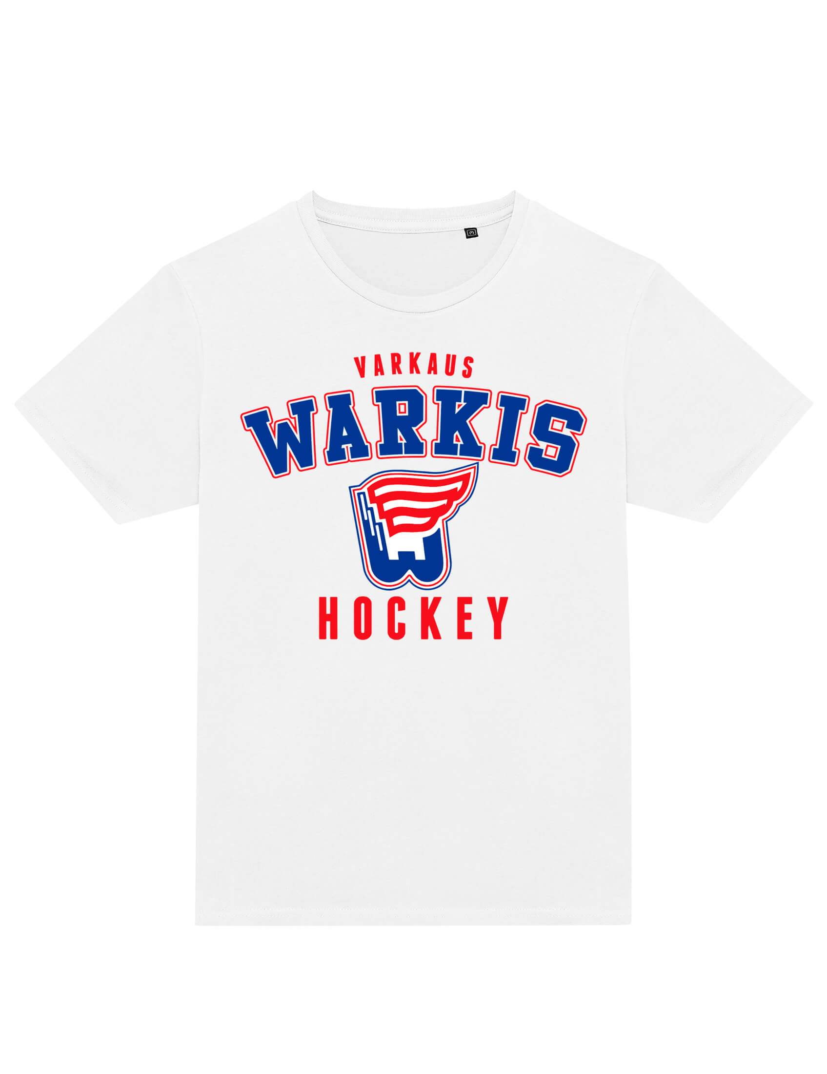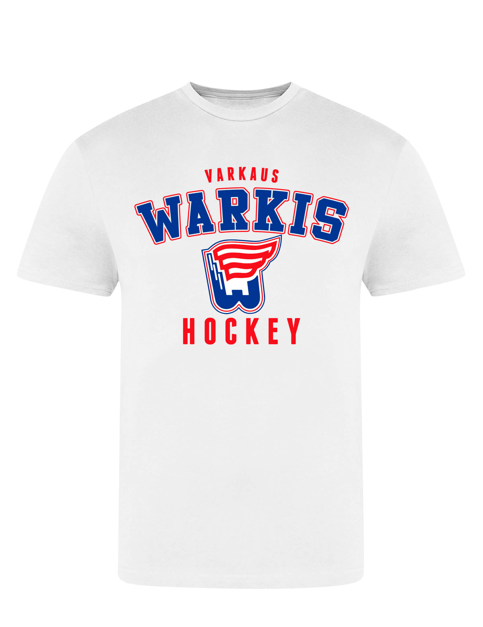Laadukas ja eettisesti valmistettu valkoinen t-paita, edessä ”Warkis Hockey” -painatus.