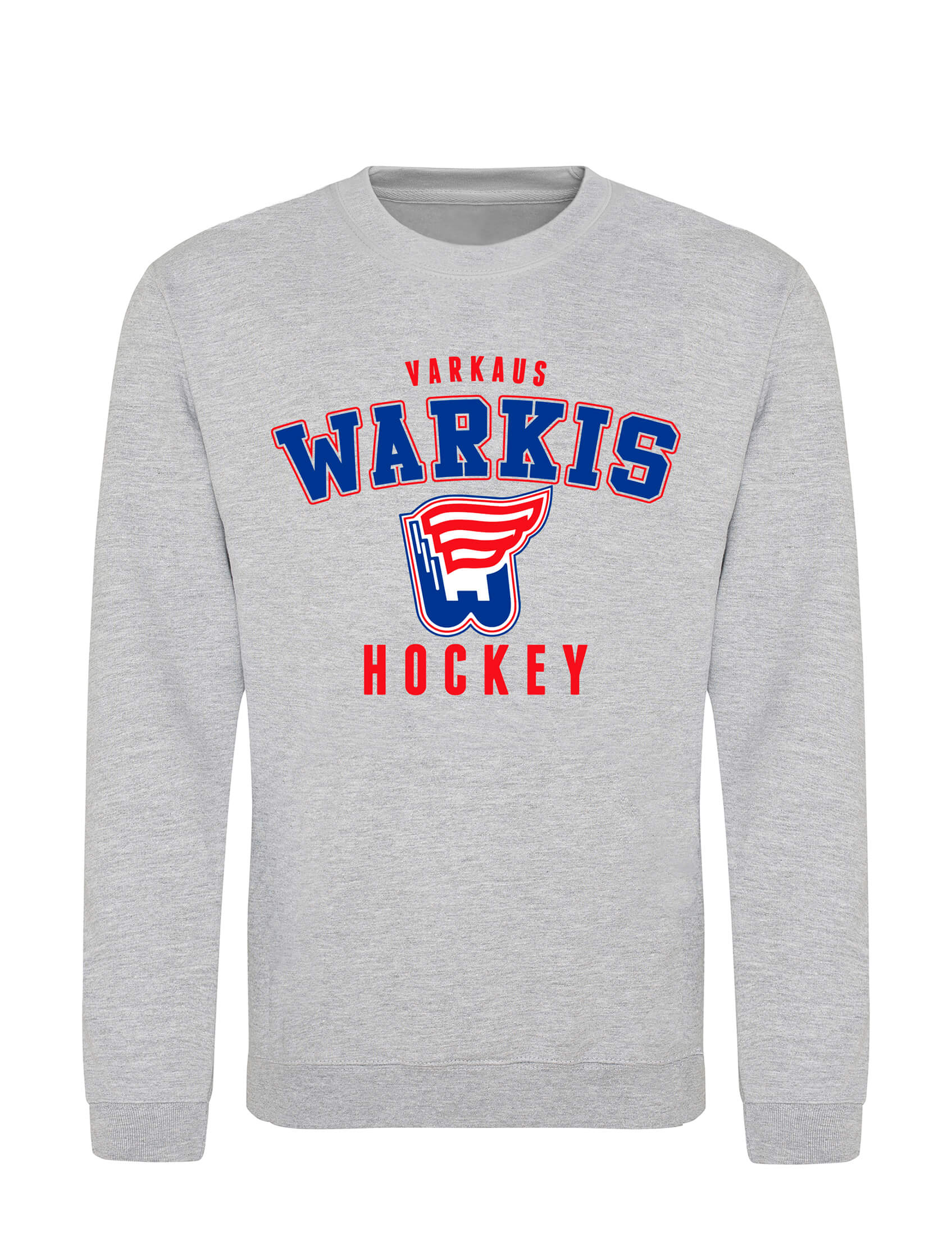 Laadukas ja eettisesti valmistettu vaaleanharmaa collegepaita, edessä ”Warkis Hockey” -painatus.